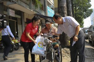 Ông Nguyễn Lục Hòa – Chủ tịch Công ty trao quà cho người bán vé số dạo cơ nhỡ